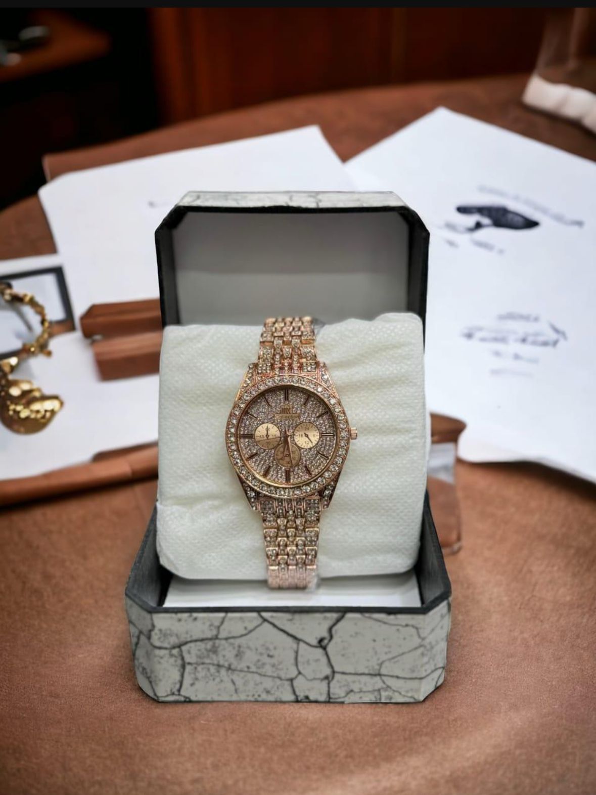 Product Description: A luxurious rose gold watch featuring diamond stones, perfect for any occasion. This premium quality stainless steel watch combines elegance and durability, making it a must-have accessory.